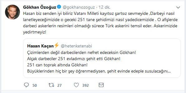Özoğuz'un paylaşımına tepki gösteren Hasan Kaçan ise "Çizimlerden değil darbecilerden nefret edeceksin Gökhan! Alçak darbeciler 251 evladımızı şehit etti Gökhan! 251 can toprak altında Gökhan! Büyüklerinden hiç bir şey öğrenmediysen, şehit evinde edeple susulacağını da mı öğrenmedin Gökhan! Bu memleket şehit evi Gökhan! Sus Gökhan!" diye yazdı.