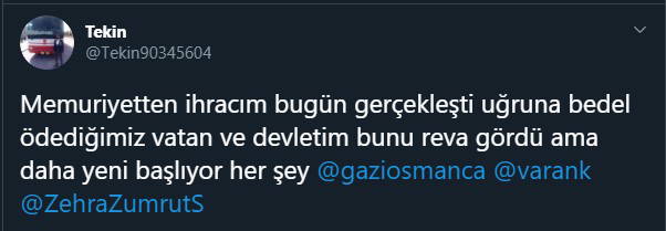 "Memuriyetten ihracım bugün gerçekleşti uğruna bedel ödediğimiz vatan ve devletim bunu reva gördü ama daha yeni başlıyor her şey"