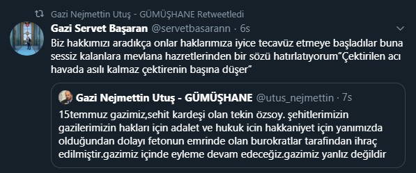 Nejmettin Utuş: "15 Temmuz gazimiz, şehit kardeşi olan Tekin Özsoy. Şehitlerimizin gazilerimizin hakları için adalet ve hukuk için hakkaniyet için yanımızda olduğundan dolayı fetonun emrinde olan bürokratlar tarafindan ihraç edilmiştir. Gazimiz içinde eyleme devam edeceğiz. Gazimiz yanlız değildir."