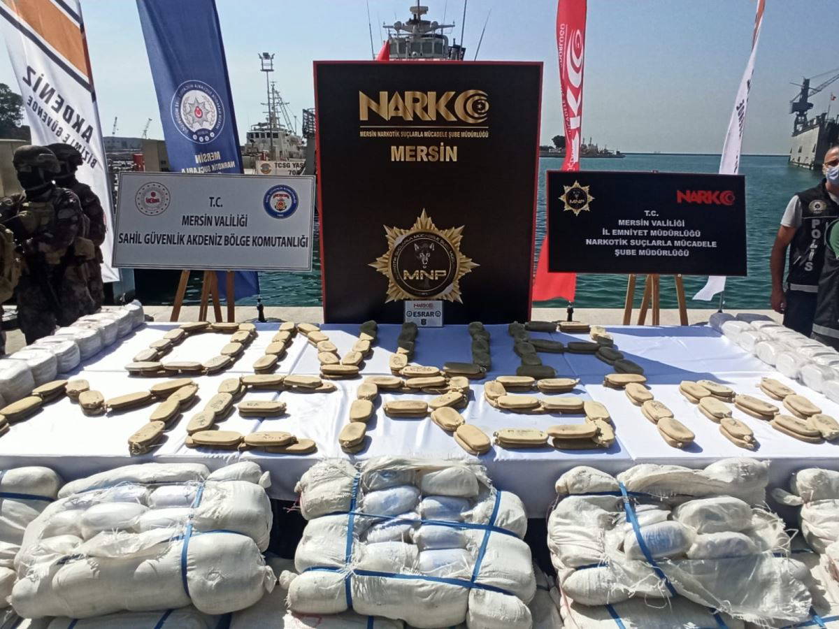 Suriye açıklarında bir gemiye yapılan operasyonda ele geçirilen 1.5 tonun üzerinde esrar, Mersin’e getirildi.