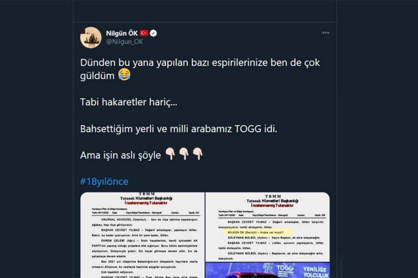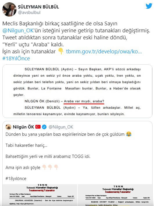CHP'li Süleyman Bülbül, sosyal medya hesabından yaptığı paylaşımda "Meclis Başkanlığı birkaç saatliğine de olsa Sayın Nilgün Ök'ün isteğini yerine getirip tutanakları değiştirmiş. Tweet atıldıktan sonra tutanaklar eski haline döndü 'yerli' uçtu 'araba' kaldı" ifadelerini kullandı.