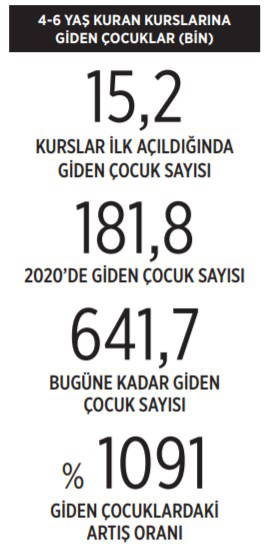 BirGün'den Mustafa M. Bildircin'in haberine göre, Kuran kurslarına katılımın düşük olduğunu savunan ve 4-6 yaş Kuran kurslarıyla 200 bin öğrenciye uğraşmayı hedefleyen Diyanet, amacını büyük oranda gerçekleştirdi. Milli Eğitim Bakanlığıyla “Okul Öncesi Çocuk Gelişimi ve Eğitimi Kurs Programı” protokolü imzalayarak din personeline çocuk gelişimi eğitimi veren Diyanet’in 4-6 yaş Kuran kurslarına son dört yılda 523 bin 823 çocuk gitti. 4-6 yaş Kuran kurslarına ilişkin her yıl açıklanan ve Diyanet’in okulöncesi eğitimdeki etkinliğini ortaya koyan verilere göre, 2015 yılı itibarıyla kurslara giden çocukların sayısı şöyle kaydedildi: