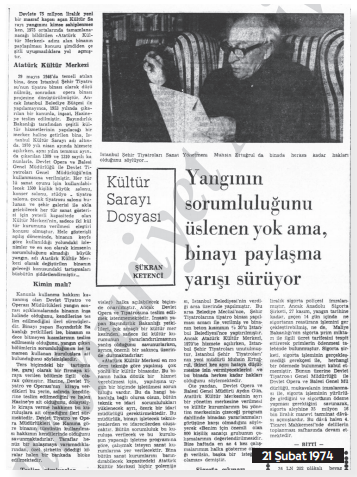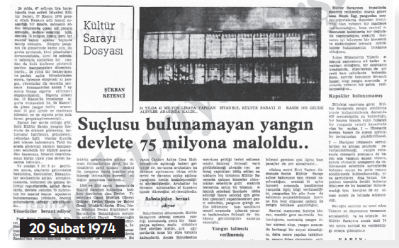 Sabotaj davasının düşmesi sonrası, 20 Şubat 1974 ve 21 Şubat 1974 tarihlerinde gazetenin 5. sayfasında “Kültür Sarayı Dosyası” başlığı ile yayımlanan iki günlük diziyi sizinle paylaşmalıyım. 24 yılda 47 milyon liraya yapılan İstanbul Kültür Sarayı, 27 Kasım 1970’te yanmıştır. Suçlusu bulunamayan devlete 75 milyon liraya mal olan yangının unutulmuş sigorta, elektrik tesisatı, ısınmadan.. yandığı hâlâ bilinmemektedir. Binayı kullanmış olan bütün kültür alanları etkinliklerinin yöneticileri de açılan davalar sonunda beraat etmişlerdir. Sabotajcılar da beraat edince suçun sorumluluğu boşlukta, bilinmez kalmıştır. Raporlar, yangın söndürmeye dönük sistemin de çalıştırılamadığını ortaya koymuştur. Taksim su deposunun da vanasının arızalandığı ortaya çıkmıştır.
