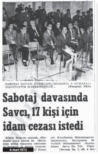 Kültür Sarayı’nı yakmak, Marmara yolcu gemisi ile Eminönü araba vapurunu batırmak suçlarından açılan Sabotaj davası sanıklarına dönük en ağır işkencelerle alınmış ifadeler sonrası 17 kişinin idamı, diğer sanıklar için ağır hapis isteminden sonra sahte senaryoya dayalı olduğu gerçeği ortaya çıktı. Yılın sonunda savcı tüm sanıkların beraatını istemek durumunda kaldı.