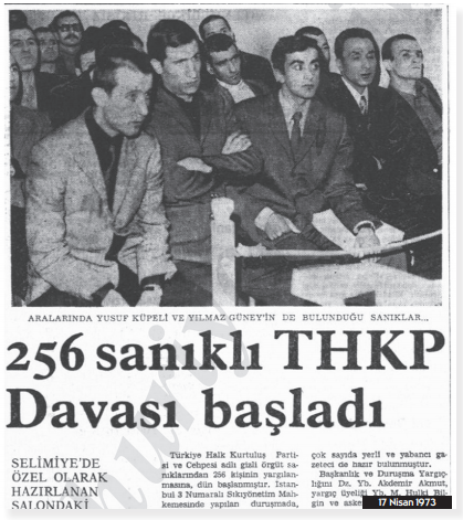 Aralarında Yusuf Küpeli ve Yılmaz Güney’in de bulunduğu 256 sanıklı THKP davası, Selimiye’de özel olarak hazırlanan salonda 16 Nisan 1973 tarihinde başlıyor. Türkiye Halk Kurtuluş Partisi ve Cephesi adlı gizli örgüt sanıklarının ilk günkü oturumda ancak 123’ünün kimlik tespitleri yapılabiliyor. Duruşma ilk günün fotoğrafı ile 17 Nisan günlü gazetemizin birinci sayfasında yayımlanıyor. Yılmaz Güney’in karesini görüp, çok sayıda yerli ve yabancı gazeteci izleyici notunu da görünce, daha önce Cumhuriyet okurları ile paylaştığımız 12 Mart’ın ilk operasyonlar döneminden kimi anıları anımsatmak gereğini duyuyorum. Turhan Selçuk’un 12 Mart’ın ilk ünlü pazarı, sokağa çıkma yasağı üzerinden yapılmış büyük operasyonlar ve işkencelerin geçmişinden kimi satır aralarını paylaşmak gerekiyor.. Turhan Selçuk’un bir gözünün kaybı ile akciğerlerindeki zar yapışması, kaburga kırıklarına mal olan 1. Şube’deki işkence günleri, kendi el yazısı ile tanıklık notlarına dönüşümüzde, aynı ortamda işkence gören Yılmaz Güney ile Ruhi Su’yu unutmak olanaksız.. Davaya düşünce özgürlüğü, insan hakları ekseninde dünya basınının ilgisini de açıklıyor.