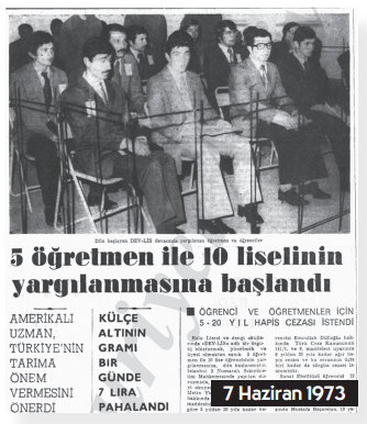 Söz öğretmen ve öğrencilerin yetiştirilmesine karşı baskılardan açılmışken 5 Haziran 1973 tarihli Cumhuriyet’te yayımlanmış haber ve kupürünü geçmemek gerekiyor. Lise öğrecileri ile öğretmenlerinin birlikte yargılandıkları davanın fotoğraflı haber kupüründen görüleceği üzere öğrenci ve öğretmenleri için 5-20 yıllık hapis cezaları isteniyor. Bolu lisesi ve dengi okullara ilişkin açılmış davanın haberinde, “Dev-Lis”in kurulmuş olması suç sayılıyor. Yargılama askeri mahkemede yapılıyor.