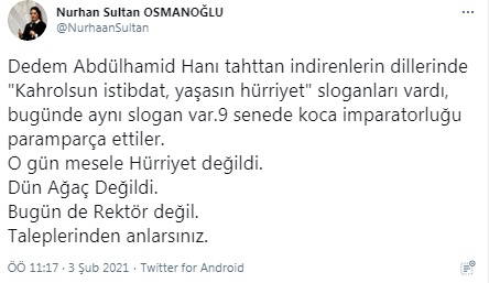 Osmanoğlu, rahatsızlığını Twitter hesabından "Dedem Abdülhamid Hanı tahttan indirenlerin dillerinde "Kahrolsun istibdat, yaşasın hürriyet" sloganları vardı, bugünde aynı slogan var.9 senede koca imparatorluğu paramparça ettiler. O gün mesele hürriyet değildi. Dün ağaç değildi. Bugün de rektör değil. Taleplerinden anlarsınız" diyerek ifade etti.