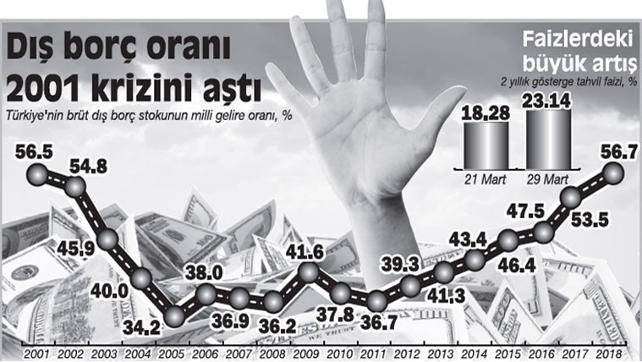 Hazine ve Maliye Bakanlığı tarafından dün açıklanan verilere göre, Türkiye’nin brüt dış borç stoku 2018 sonu itibarıyla 444.8 milyar dolar olurken, dış borcun milli gelire oranı yüzde 56.7 ile kriz yılı olan 2001’deki yüzde 56.5’i aşarak yıllık bazda rekor kırdı. Bu oran 2005’te yüzde 34.2 seviyelerine kadar gerilemişti.