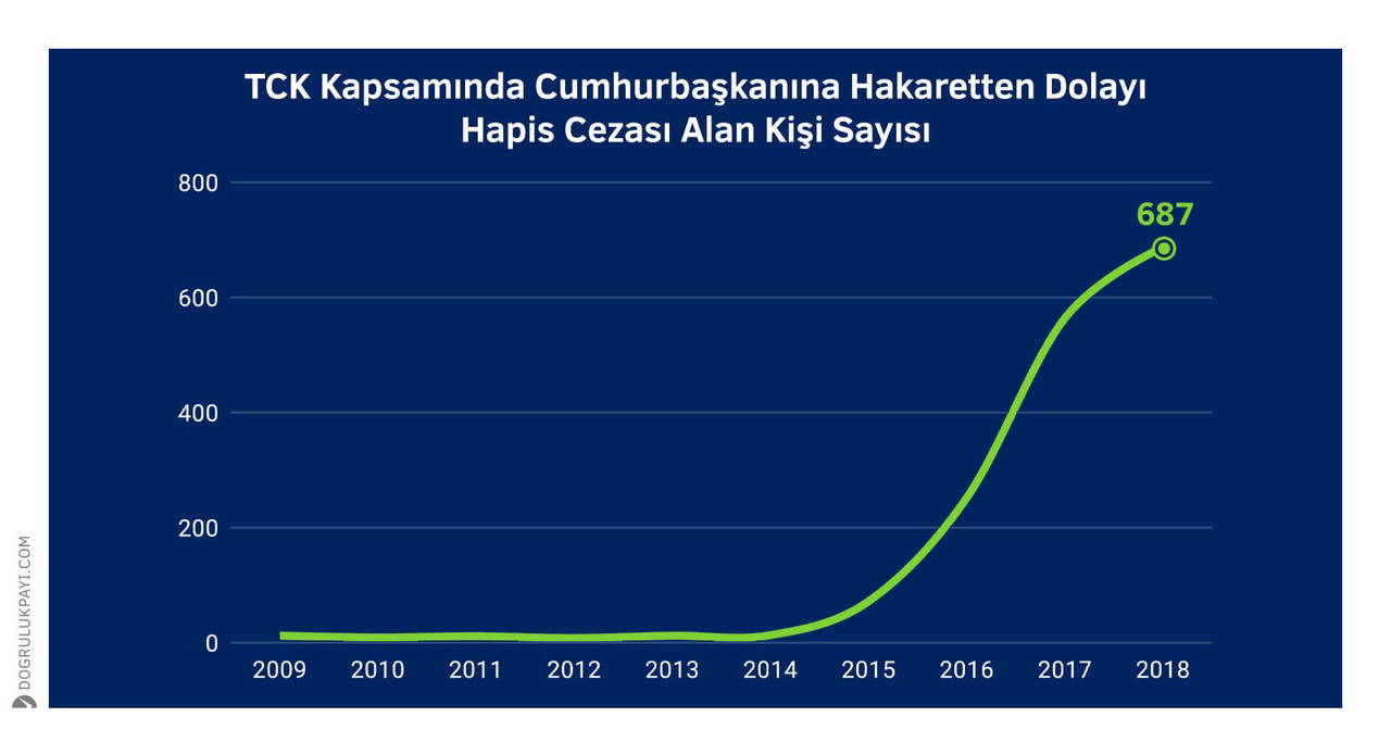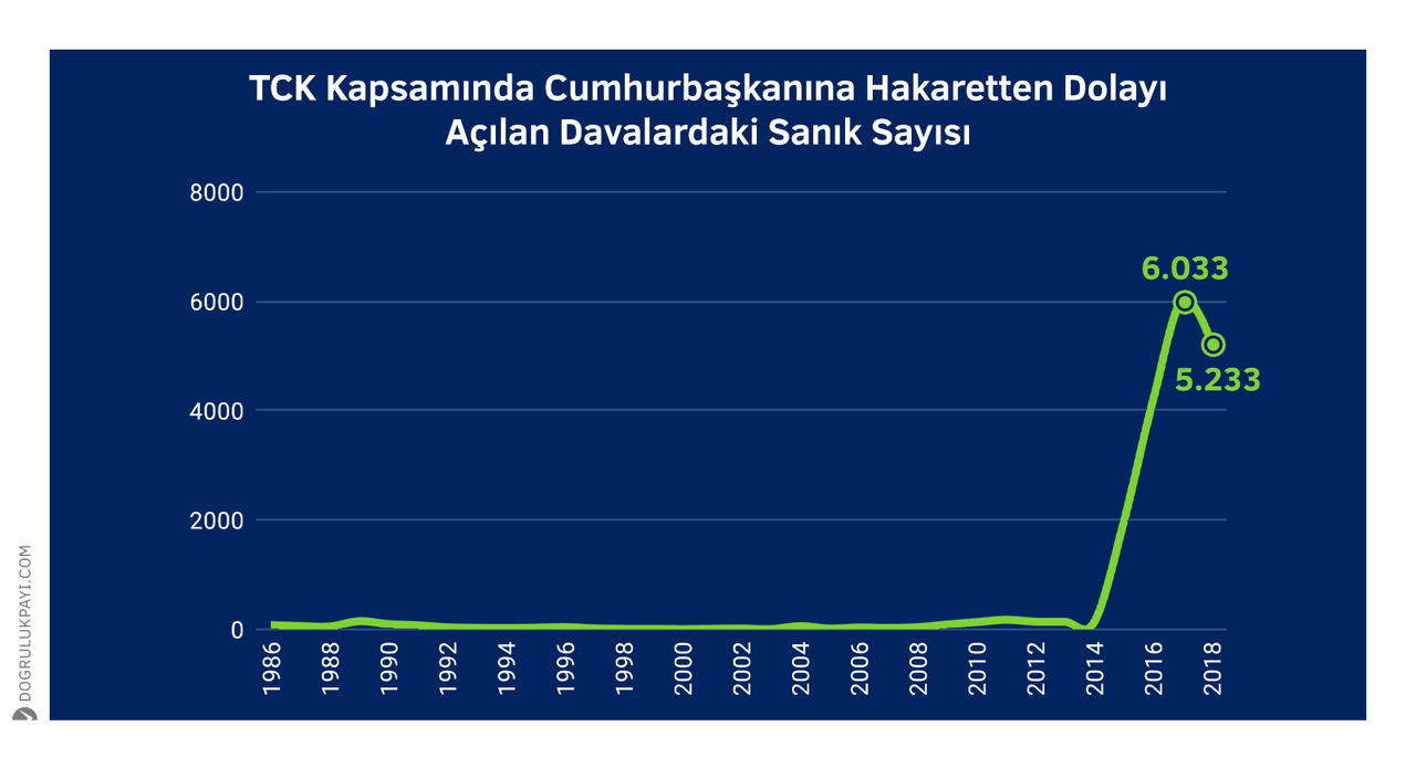 Adalet Bakanlığı Adli Sicil ve İstatistik Genel Müdürlüğü tarafından 1986 yılından 2017 yılına kadar yayınlanan ve TCK kapsamında cumhurbaşkanına hakaretten dolayı açılan davalardaki sanık sayılarını incelediğimizde, 1986’den 2018’e kadarki dönemde açılan davalardaki sanık sayıları toplam 19.122 oldu.