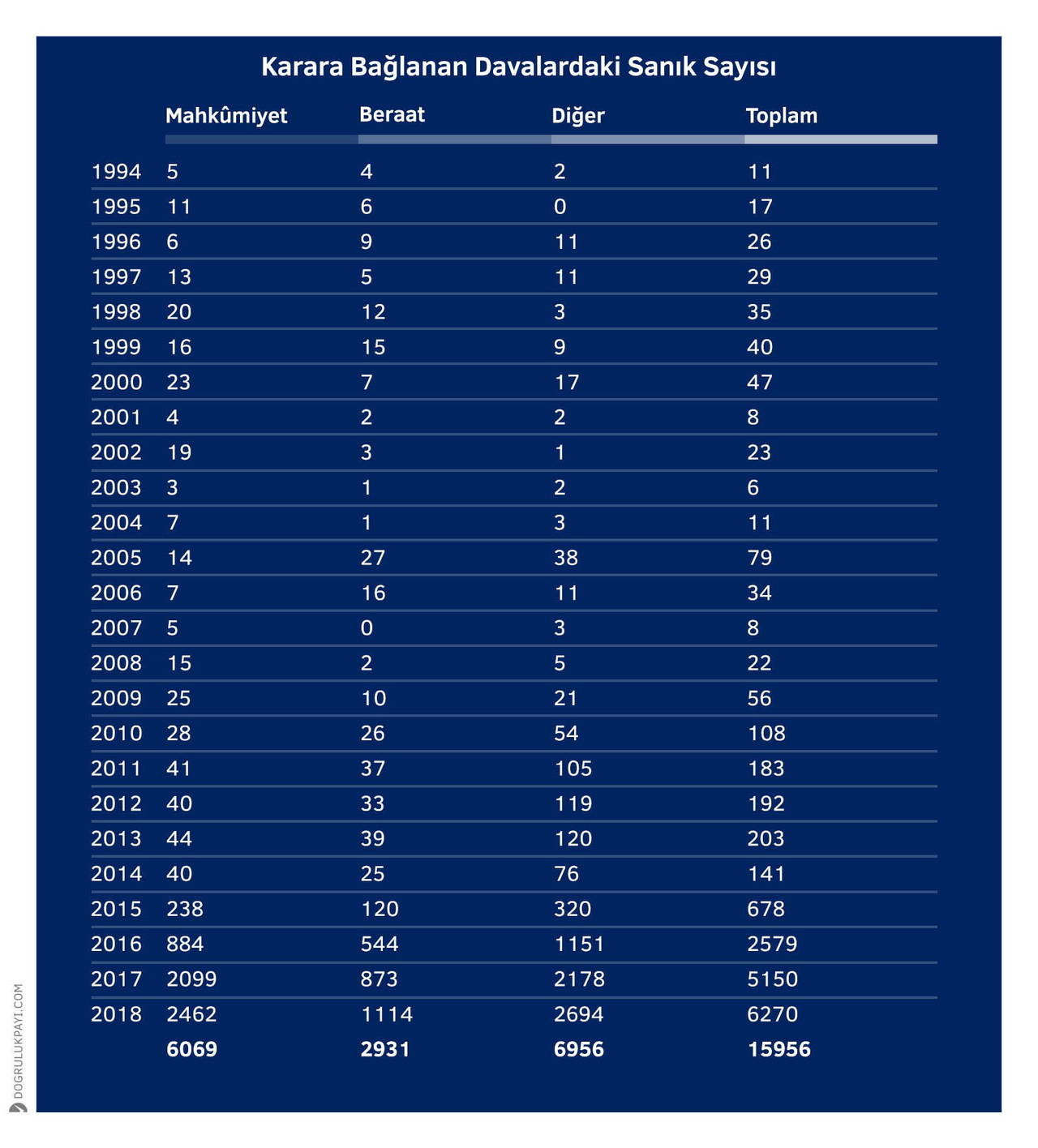 TCK kapsamında karara bağlanan davalarda ise mahkûmiyet, beraat, davanın düşmesi ve hükmün açıklanmasının geri bırakılması gibi kararlar verilebiliyor. Adalet Bakanlığı Adli Sicil ve İstatistik Genel Müdürlüğü tarafından yayınlanan, yıllara göre karara bağlanan cumhurbaşkanına hakaret davalarındaki sanık sayılarını incelediğimizde; 1994 yılından 2018 yılına kadar cumhurbaşkanına hakaretten dolayı toplam 15.956 sanığın davası karara bağlandı. Bu yıllar içerisinde hakkında mahkûmiyet kararı verilen sanık sayısı 2017 yılına kadar toplam 3.607 iken, 2018 yılında bu sayı 2.462 kişi artarak toplam 6.069 oldu.