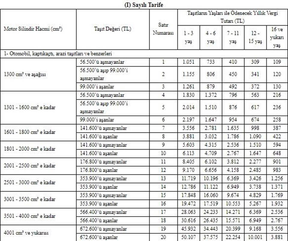 1-3 yaş aralığında olan otomobillerin 2021 yılındaki motorlu taşıtlar vergisi (MTV) motor silindir hacmi 1300 cc ve aşağısında olanlar için 964 liradan 1051 liraya çıkacak. Aynı yaşta motor silindir hacmi 1301 - 1600 cc arasında olan otomobiller için MTV, 1678 liradan 1830 liraya, 1601 - 1800 cc arasında olanlar için 2964 liradan 3234 liraya, 1801 - 2000 cc arasında olanlar için 4 bin 670 liradan 5 bin 95 liraya ve 2001 - 2500 cc arasında olanlar için ise 7 bin 3 liradan 7 bin 640 liraya yükselecek.