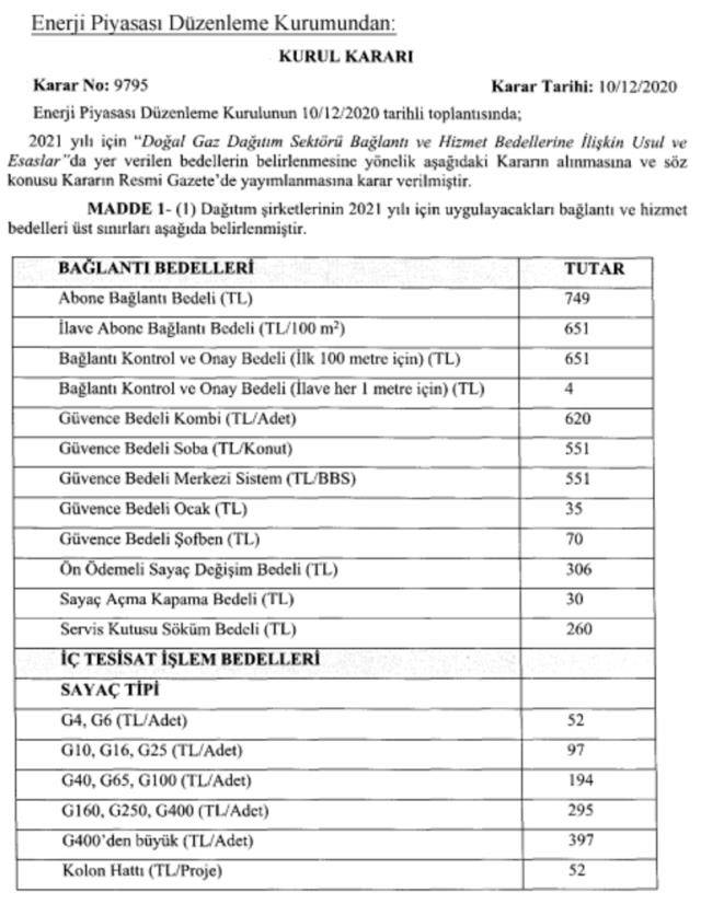 Enerji Piyasası Düzenleme Kurulu (EPDK), 2021 yılı için doğal gaz dağıtım sektörü bağlantı ve hizmet bedellerini belirledi. EPDK'nın konu ile ilgili kararı Resmi Gazete'de yayımlandı. Fiyatlar 1 Ocak 2021'den itibaren geçerli olacak.