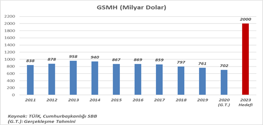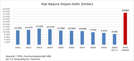 2011'de bu hedefler açıklandığında ülkemizin milli geliri 838 milyar dolar’dı. Sayın Erdoğan 2020’de gelirimizi 702 milyar dolara düşürdünüz. 10 yılda milli geliri 136 milyar dolar eritmişken, gelecek üç yılda bu “performansla” milli gelirimizi 1,3 trilyon dolar nasıl artıracaksınız?