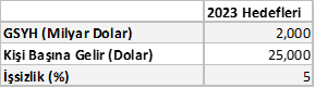 AK Parti Genel Başkanı bugün “Türkiye’yi 2023 hedefleriyle biz buluşturacağız” dedi. Sayın Erdoğan, “2023 hedeflerini” 10 yıl önce davul zurnayla ilan ettiniz. 2023’de ülkemizin en büyük 10 ekonomi arasına gireceğini ve aşağıdaki hedeflere ulaşacağını taahhüt ettiniz.