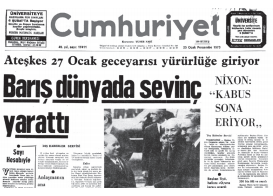 Geçen haftaki sayfamız Vietnam Savaşı’nda Amerika’yı uzlaşmaya zorlayan dünya, galiba daha ağırlıklı kendi kamuoyu baskısının sonucunun ilk manşet haberi ile noktalanmıştı. Bir gün sonra yayımlanan, bugün paylaştığımız 25 Ocak tarihli manşetimizde ise barışın dünyada yarattığı sevinç ile kimi koşullarının bilgisi yer alıyor. Nadir Nadi köşesinde “Sayı Hesabıyla” başlığı ile çağın en güçlü devletinin mazlum, yoksul, kendi halinde yaşayan ama bağımsızlığına ve özgürlüğüne düşkün bir ulusa karşı yürüttüğü savaşın, ölen insanlar ve ekonomik yaşamsal boyutları üzerinden kimi çarpıcı sayılarını aktarıyor. Amerika içinde dünya vicdanını zaman zaman isyana yönelten gelişmelerinden satırbaşlarını veriyor. Nixon doktrininin çökmesi yanında, ileriye dönük Vietnam halkının çıkarlarından çok Amerikan gerçeklerinin doktrininin yararına işler yapılması tehdidinin ortadan kalkmadığına işaret ediyor. Vietnamda kapanan kanlı dramdan sonra başlamasından kaygı duyulan politik dramın dünyaca yakından izleneceğinin altını çiziyor