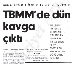 Sıkıyönetimin 9 ilde 2 ay daha uzatılması kararının görüşmelerinde Meclis’te çıkan kavgayı 26 Ocak tarihli gazetemiz kupürü ile paylaşıyoruz. Melen’in “İşkenci iddiaları yalandır” demesine itiraz eden Ecevit’in MGP’liler tarafından dövülmesi zor önlenebiliyor. Haberin kendisi ayrıca yorumu gerekli kılmıyor.
