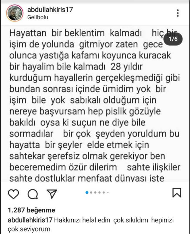 Çanakkale’nin Gelibolu ilçesinde yaşayan, fırıncı ustası olduğu öğrenilen ve iş bulamayan 28 yaşındaki Abdullah Kiriş isimli genç, sosyal medya hesabından ‘hayattan hiçbir beklentisinin’ kalmadığını belirten uzun bir not yazarak intihar girişiminde bulundu.