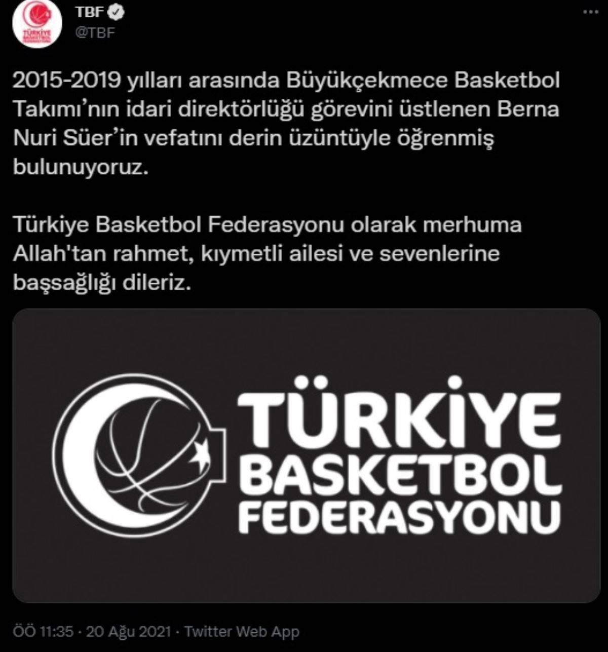 Türkiye Basketbol Federasyonu (TBF), da, gazeteci için bir başsağlığı mesajı yayımladı. Açıklamada, "2015-2019 yılları arasında Büyükçekmece Basketbol Takımı’nın idari direktörlüğü görevini üstlenen Berna Nuri Süer’in vefatını derin bir üzüntüyle öğrenmiş bulunuyoruz. Türkiye Basketbol Federasyonu olarak merhuma Allah’tan rahmet, kıymetli ailesi ve sevenlerine başsağlığı dileriz" ifadeleri kullanıldı.