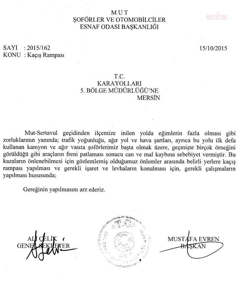 Mut Şoförler ve Otomobilciler Esnaf Odası Başkanı Mustafa Evren imzasıyla bölge müdürlüğüne gönderilen yazıda, “Yolda eğimin fazla olması gibi zorlukların yanında; trafik yoğunluğu, ağır yol ve hava şartları, ayrıca bu yolu ilk defa kullanan kamyon ve ağır vasıta şöförlerimiz başta olmak üzere, geçmişte birçok örneğini gördüğümüz gibi araçların freni patlaması sonucu can ve mal kaybına sebebiyet vermiştir” ifadeleri yer aldı.