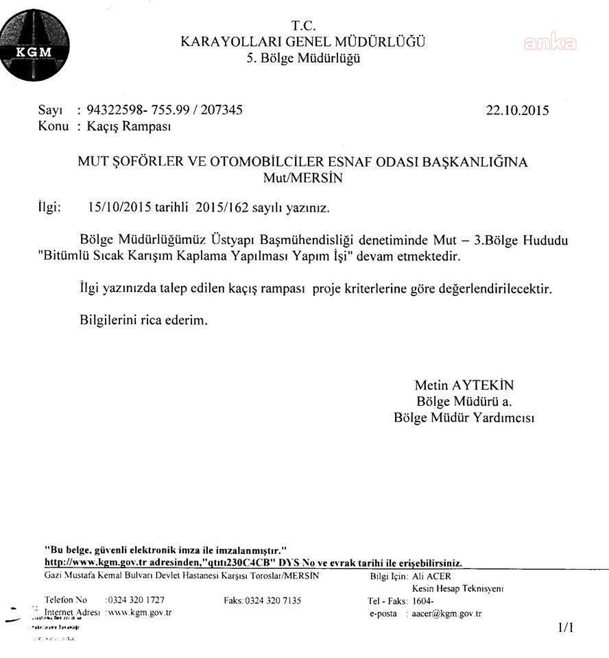 Karayolları 5. Bölge Müdürlüğü tarafından, bir hafta sonra 22 Ekim 2015’te yazılan yanıt yazısında ise“…ilgi yazınızda talep edilen kaçış rampası proje kriterlerine göre değerlendirilecektir” denildi.