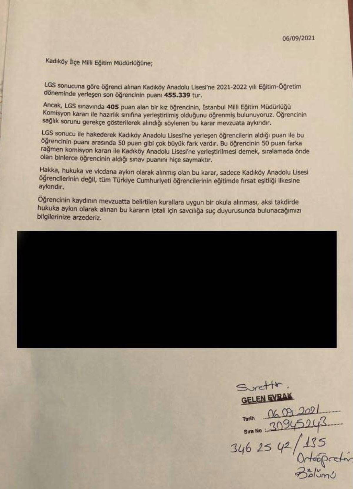 Kadıköy İlçe Milli Eğitim Müdürlüğü’ne gönderilen şikâyet dilekçesinde, “LGS sonucu ile hak ederek Kadıköy Anadolu Lisesi’ne yerleşen öğrencilerin aldığı puan ile bu öğrencinin puanı arasında 50 puan gibi çok büyük fark vardır. Bu öğrencinin 50 puan farka rağmen komisyon kararı ile Kadıköy Anadolu Lisesi’ne yerleştirilmesi demek, sıralamada önde olan binlerce öğrencinin aldığı sınav puanını hiçe saymaktır” ifadeleri yer aldı.