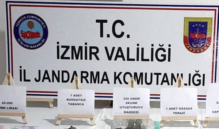 İzmir Jandarma Komutanlığı ekipleri, Mersinalanı Mahallesi'nde yaşayan G.S.'nin uyuşturucu ve ruhsatsız tabanca sattığı bilgisi üzerine harekete geçti. G.S.’nin adresine baskın yapan ekipler, narkotik köpek 'Varlı' ile yaptıkları aramada; 1 kilo 600 gram esrar, 1 ruhsatsız tabanca, 1 hassas terazi ile uyuşturucu satışından kazanıldığı değerlendirilen 20 bin TL ele geçirdi.