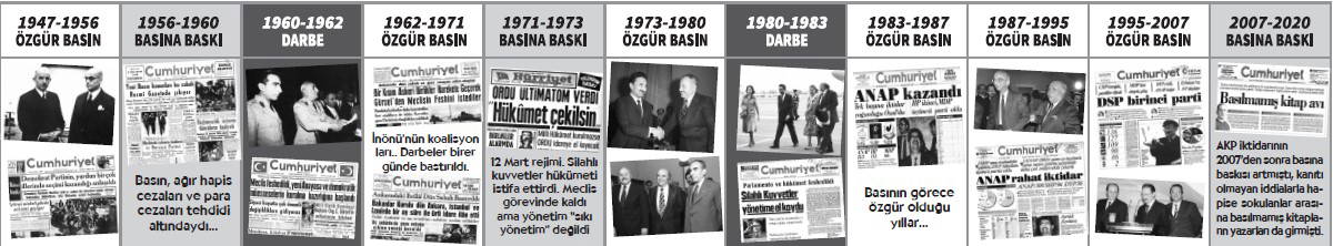 1947’de hızlanan demokratikleşme sürecinin ilk yıllarında, basın özgürlüğü görece genişlemiştir. Ama 1954’te başlayıp 1956’da artan baskılar sonunda çıkan olayları, 27 Mayıs 1960’tan 1962’ye kadar süren bir askeri yönetim dönemi izlemiştir. Sonra 9 yıllık bir özgürlük döneminin arkasından “12 Mart rejimi”nin baskıları... Yedi yıllık özgürlük dönemi ve 12 Eylül 1980 rejiminin baskılı yılları.. Bunun arkasından gelen 1983’ten 2007’ye kadarki yılları ise, basının –tabii gene görece– bir özgürlük dönemi sayılabilir. Sonuç olarak tablodaki 73 yılın, yaklaşık 49 yılında, yasalar ve uygulamalar açısından yaşadığımız ortam, –görece de olsa– demokratik bir ortam sayılır. Tabii, bu, ülkedeki siyasal yönetimlerin basına karşı tutumu ve uygulamaları açısından böyledir. Türkiye basını o 73 yıl içinde, cinayetler ve tehditler dönemleri de yaşamıştır ki, o da ayrı ve çok önemli bir konudur. Bütün etkenleriyle birlikte ele alınıp, kapsamlı araştırmalarla ve bütün ayrıntılarıyla aydınlığa çıkarılması gerekir.