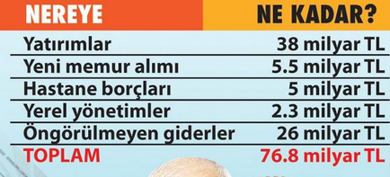 – Güçlü toparlanmayı desteklemek amacıyla yatırımlar için 38 milyar lira, eğitim ve adalet başta olmak üzere ilave personel istihdamı kapsamında 5.5 milyar lira, kamu hastanelerinin piyasaya olan borçları için 5 milyar lira, mahalli idarelere 2.3 milyar lira ve kurumların öngörülmeyen ihtiyaçları için 26 milyar lira ilave harcama yapacağız. Bu nedenle 2020 bütçe açığı geçici olarak artacak.