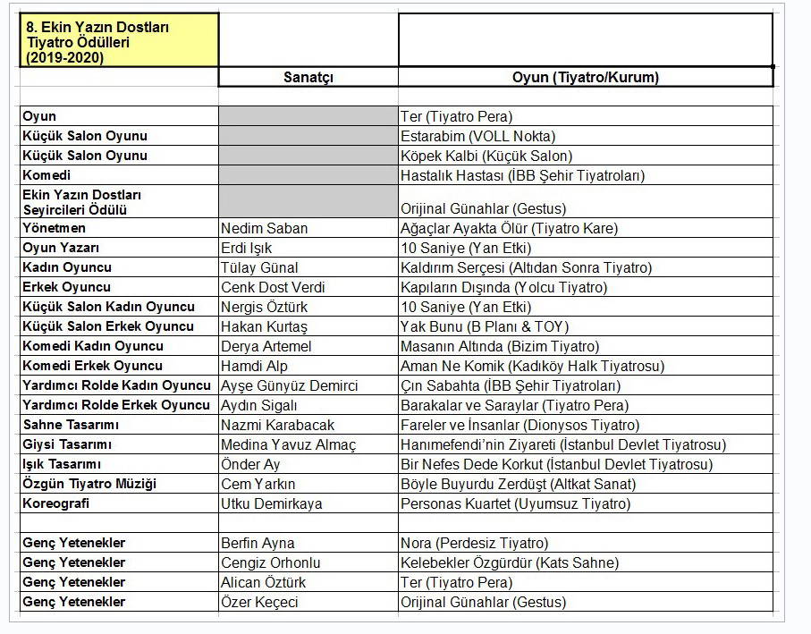 Salgın hastalıktan ötürü tiyatroların salonlarının 13 Mart’ta kapatılması nedeniyle bu tarihten itibaren 30 Nisan’a dek görmeyi planladığımız oyunları izleyemedik. Önümüzde iki seçenek vardı, yeterli sayıda arkadaşımızın izlediği oyunları değerlendirmek ya da bu yılın ödüllerini iptal etmek. Şu sırada herbirinin büyük sıkıntı içinde olduğunu bildiğimiz tiyatrolarımıza bir soluk da biz verebilmek için önceki yıllardaki ödül sürecimizi uygulamaya karar verdik. Yeterince sayıda seçici kurul üyemizin izleyemediği oyunları, eğer oynanmayı sürdürürlerse gelecek yılın seçkisinde değerlendireceğiz.