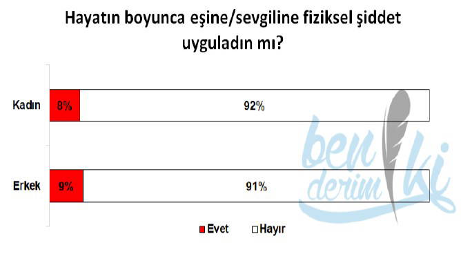 Kadınların %20’si eşinden veya sevgilisinden hayatında en az bir defa fiziksel şiddet gördüğünü belirtirken, fiziksel şiddet uyguladığını belirten erkeklerin oranı yalnızca %9.