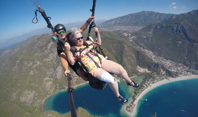 Fethiye'ye İngiltere'den tatile gelen Linda Aparez, yamaç paraşütüyle atlayış gerçekleştirmek için yaklaşık bin 750 metre yükseklikteki Babadağ'a çıktı.