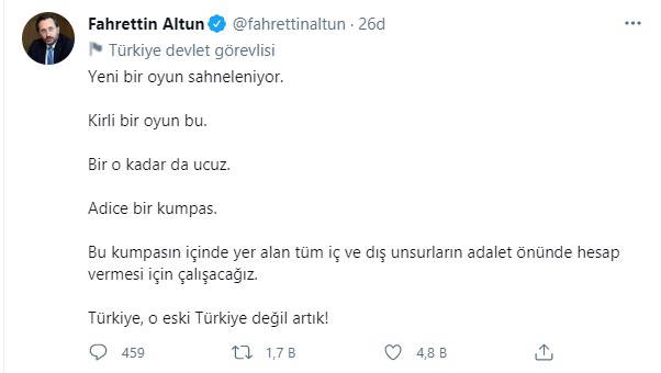 "Yeni bir oyun sahneleniyor. Kirli bir oyun bu. Bir o kadar da ucuz. Adice bir kumpas. Bu kumpasın içinde yer alan tüm iç ve dış unsurların adalet önünde hesap vermesi için çalışacağız. Türkiye, o eski Türkiye değil artık!"