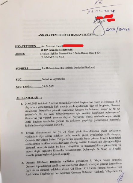 CHP İstanbul Milletvekili Av. Mahmut Tanal, 24 Nisan’da 1915 olaylarına ilişkin yaptığı açıklamada “Soykırım” ifadesini kullanan ABD Başkanı Joe Biden hakkında “Nefret ve ayrımcılık” suçunu işlediği iddiasıyla Ankara Cumhuriyet Başsavcılığı’na suç duyurusunda bulundu.