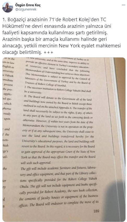 Bununla birlikte, Odatv'nin haberine göre, İstanbul Üniversitesi Araştırma Görevlisi Özgün Emre Koç tarafından Boğaziçi arazisiyle ilgili dikkat çeken bir belge paylaşıldı. Belgede, 1971 yılında Boğaziçi arazisinin Türkiye Cumhuriyeti tarafından Robert Koleji’nden alındığı, arazinin başka amaçlarla kullanımı durumunda, New York Eyalet Mahkemesi tarafından geri alınabileceği belirtildi.