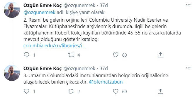 Özgün Emre Koç belge ile ilgili, “Resmi belgelerin orijinalleri Columbia University Nadir Eserler ve Elyazmaları Kütüphanesi'nde arşivlenmiş durumda. İlgili belgelerin kütüphanenin Robert Kolej kayıtları bölümünde 45-55 no arası kutularda mevcut olduğunu gösterir” ifadelerini kullandı.