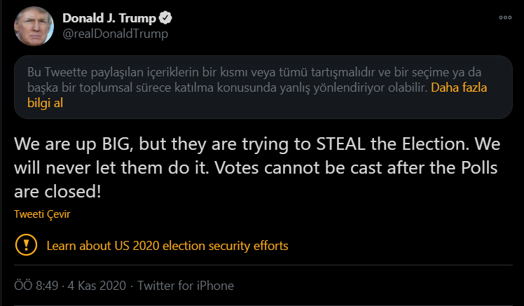 sonuçların kıran kırana devam eden başkanlık yarışında erken zafer ilan eden tweetleri etiketleyeceğini söyledi. Trump’ın Twitter’da yaptığı “galibiyet” paylaşımı Twitter tarafından silindi.