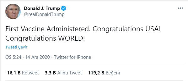 FDA’dan onay alan Pfizer/BioNTech aşısının ilk uygulaması New York’ta gerçekleştirildi. New York'taki "Long Island Yahudi Tıp Merkezi'nde" aşıyı vurulan yoğun bakım hemşiresi Sandra Lindsay yaptığı açıklamada, “Bu gün umutluyum,rahatladım. İyileşmenin yakında olacağını hissediyorum" dedi. Lindsay, ülkedeki ilk aşılanan kişi oldu.