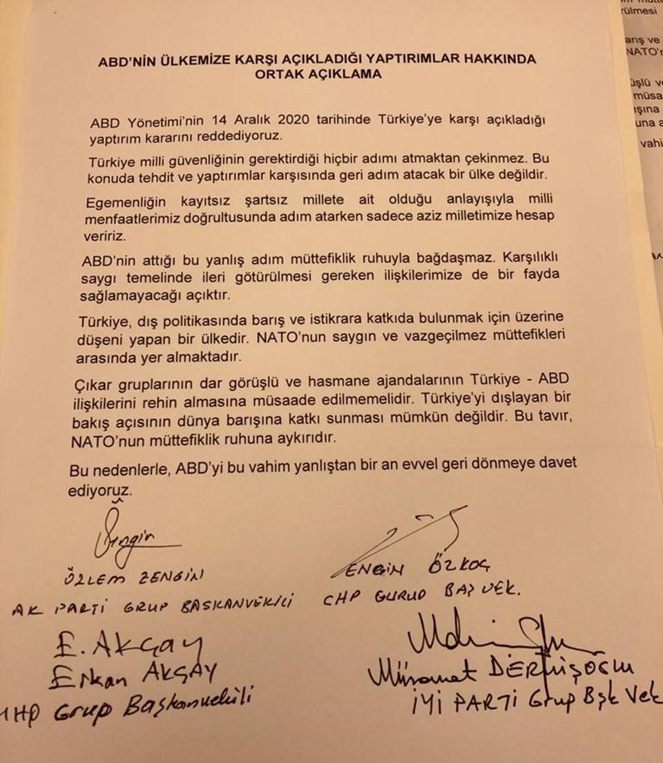 ABD yönetiminin 14 Aralık 2020 tarihinde Türkiye’ye karşı açıkladığı yaptırım kararının reddedildiği ifade edilen açıklamada, "Türkiye milli güvenliğinin gerektirdiği hiçbir adımı atmaktan çekinmez. Bu konuda tehdit ve yaptırımlar karşısında geri adım atacak bir ülke değildir" ifadesi yer aldı.