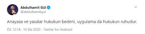 Gül, paylaşımında, "Anayasa ve yasalar hukukun bedeni, uygulama da hukukun ruhudur." ifadelerini kullandı.