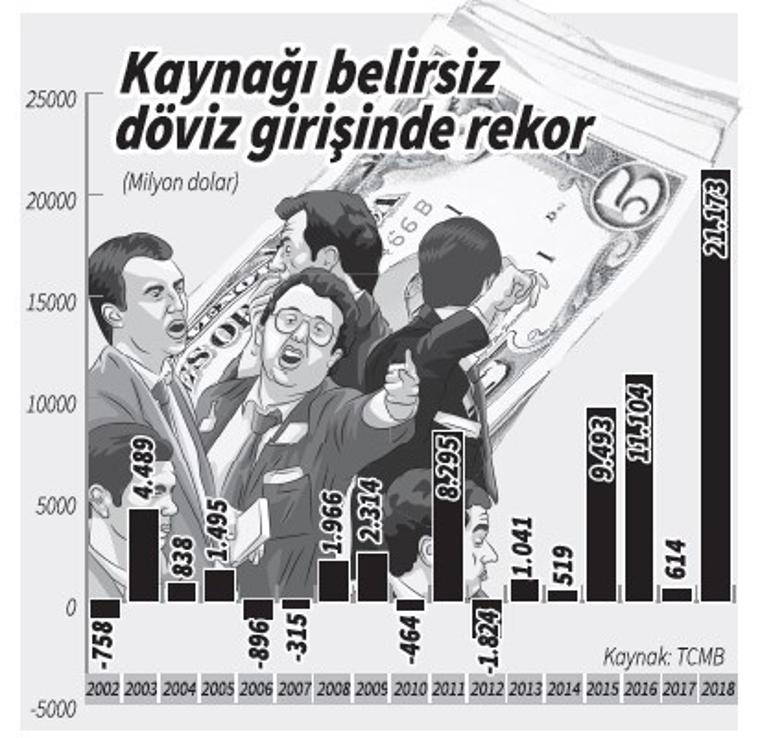 2018’de 27.6 milyar dolar cari açık veren Türkiye, 21.1 milyar dolar kaynağı belirsiz döviz girişiyle bu açığı kapattı.