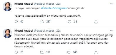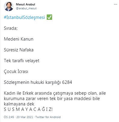 İstanbul Sözleşmesi üzerinden Cumhuriyetle hesaplaşma hedefini gizlemeyen bir diğer isim ise "nafaka" konusuyla ilgili olarak zaman zaman “Süresiz Nafaka Mağdurları Platformu Kurucu Başkanı” sıfatıyla medya organlarında boy gösteren Mesut Arabul isimli şahıs oldu. İstanbul Sözleşmesi'nden çekilme kararını sosyal medya hesabından “Yaşayıp yaşayabileceğim en mutlu günü yaşıyorum” diyerek kutlayan Arabul, “Lakin! sözleşme gereği çıkarılan 6284 sayılı yasa ve belirlenen politikadan vazgeçilmediği sürece sözleşmenin feshedilmiş olması tek başına yeterli değil. Yaşanan sorunlar devam edecek.” dedi.