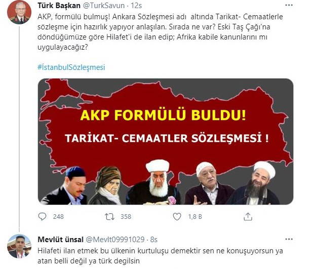 Türkiye'nin İstanbul Sözleşmesi’nden AKP’li Cumhurbaşkanı Tayyip Erdoğan’ın kararıyla çekilmesi sonrası dinci çevreler Erdoğan'a 'teşekkür' sırasına girdi. Bunların arasında kimileri yeni hedeflerinin Medeni Kanun olduğunu açıkça dillendirmeye başlarken AKP gençliği de "hilafet"e çağrı yaptı.