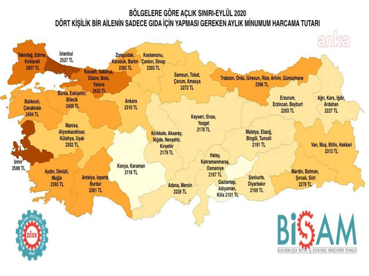 Ailelerin gıda için yapması gereken harcama illere göre incelendiğinde ise 4 kişilik ailenin gıda harcaması; İzmir’de 2 bin 588 lira, İstanbul’da 2 bin 527 lira, Ankara’da ise 2 bin 310 liraya ulaşıyor.