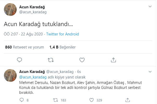 Tutuklanma kararı Karadağ'ın Twitter hesabından duyuruldu.