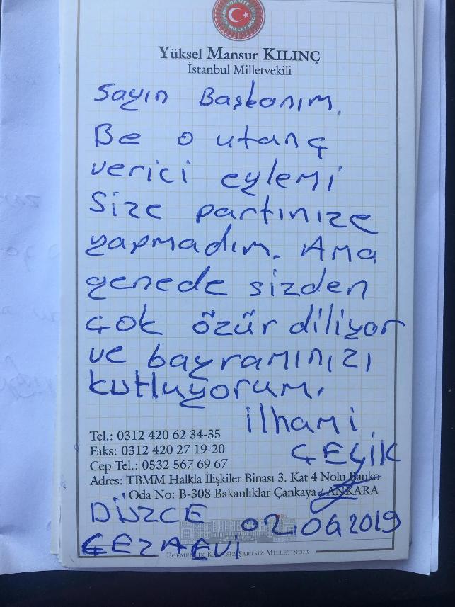 Kılınç, cezaevindeki ziyarete ilişkin şunları kaydetti, “Gerçekleştirdiği eylem nedeniyle çevresindeki CHP’lilerden utandığını, onun için de CHP Genel Başkanı Kemal Kılıçdaroğlu tarafından affedilmesinin her şeyden önemli olduğunu ifade etmiştir. Kendisine genel başkanımızın selamını getirdiğimi, görüşmenin içeriğini genel başkanımıza arz edeceğimi bildirdim. Ayrıca kendisi el yazısı ile düşüncelerini not kağıdına dökerek şöyle yazmıştır: “Sayın Başkanım, Ben o utanç verici eylemi size partinize yapmadım. Ama gene de sizden çok özür diliyor ve bayramınızı kutluyorum.” (Duvar)