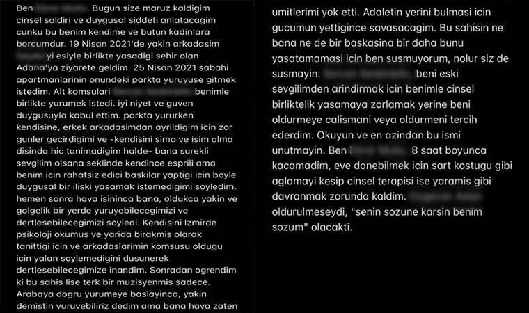 19 Nisan 2021 tarihinde arkadaşını ziyaret etmek için Adana'ya gelen ve ziyarete gittiği arkadaşının komşusu S.K. tarafından cinsel istismara uğradığını öne süren E.M., yaşadıklarını sosyal medya hesabından paylaştı. Parkta yürüme bahanesiyle S.K. tarafından ıssız alanlara götürüldüğünü ve başta sözlü tacize daha sonra ise cinsel istismara maruz kaldığını anlatan E.M., duyurusunun ardından kendisine diğer mağdurlardan gelen mesajları paylaştı.