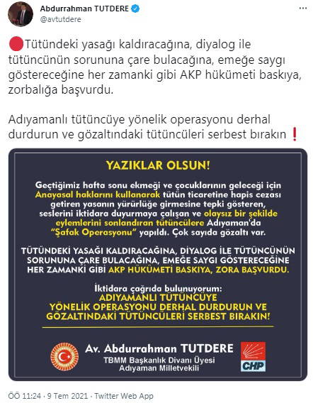 Tutdere, gözaltılarla ilgili sosyal medya hesabından yaptığı açıklamada da "Tütündeki yasağı kaldıracağına, diyalog ile tütüncünün sorununa çare bulacağına, emeğe saygı göstereceğine her zamanki gibi AKP hükümeti baskıya, zorbalığa başvurdu. Adıyamanlı tütüncüye yönelik operasyonu derhal durdurun ve gözaltındaki tütüncüleri serbest bırakın" çağrısında bulundu.