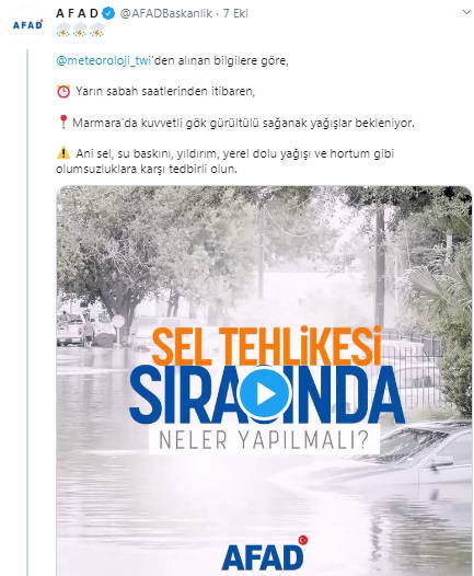 Meteroloji'nin raporlarına dikkat çekilen AFAD uyarısında "Marmara’da kuvvetli gök gürültülü sağanak yağışlar bekleniyor. Ani sel, su baskını, yıldırım, yerel dolu yağışı ve hortum gibi olumsuzluklara karşı tedbirli olun." denildi.