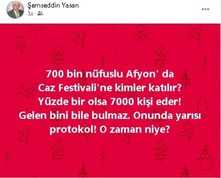 Festivale ilişkin sosyal medya hesabı üzerinden paylaşımlarda bulunan Yasan, "700 bin nüfuslu Afyon’da Caz Festivali’ne kimler katılır? Yüzde bir olsa 7 bin kişi eder. Gelen bini bile bulmaz. Onunda yarısı protokol. O zaman niye?” diye sordu.