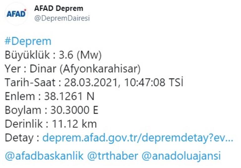 İçişleri Bakanlığı Afet ve Acil Durum Yönetimi Başkanlığı Deprem Dairesi Başkanlığı'nın verilerine göre, merkez üssü Afyonkarahisar'ın Dinar ilçesi olan Richter Ölçeği'ne göre 3.6 büyüklüğünde deprem meydana geldi.
